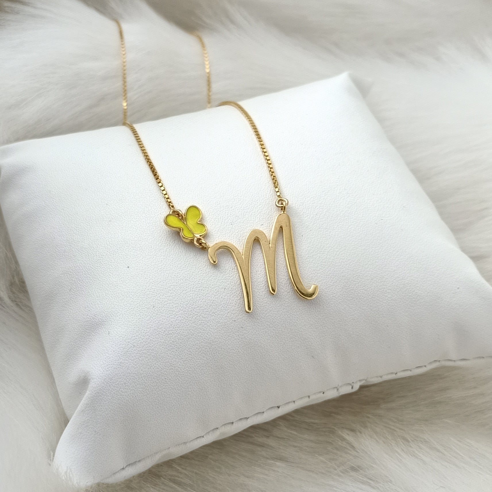 A charming pendant featuring a bold 'M' initial and a delicate yellow butterfly charm. Perfect for personalizing your style with a touch of whimsy and grace. Name and size can be customised. To personalise your piece, WhatsApp us at +91 98332 31955.