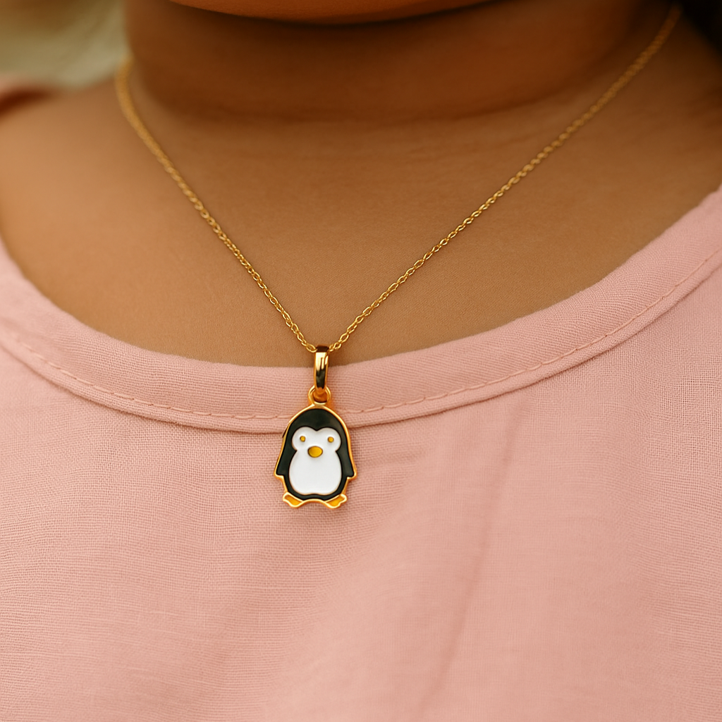 This adorable penguin pendant, crafted in 18kt gold, features a charming black and white design with a tiny orange beak and feet. Its playful and cute appearance makes it a perfect accessory for young animal lovers or a delightful gift for any occasion. Lightweight and charming, it adds a fun touch to any jewelry collection.